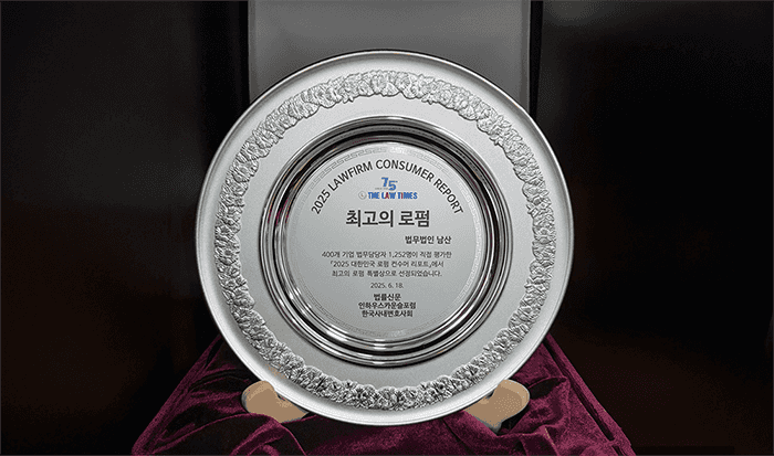 법률신문사, 인하우스카운슬포럼 및 한국사내변호사회가 공동으로 주관해 400개 기업 법무담당자 1,252명의 평가 의견을 종합한 ‘2025 대한민국 로펌 컨수머 리포트’에서 법무법인 남산은 “탁월한 법률 서비스와 고객 중심의 역량을 높이 평가받아최고의 로펌”으로 선정되었습니다.